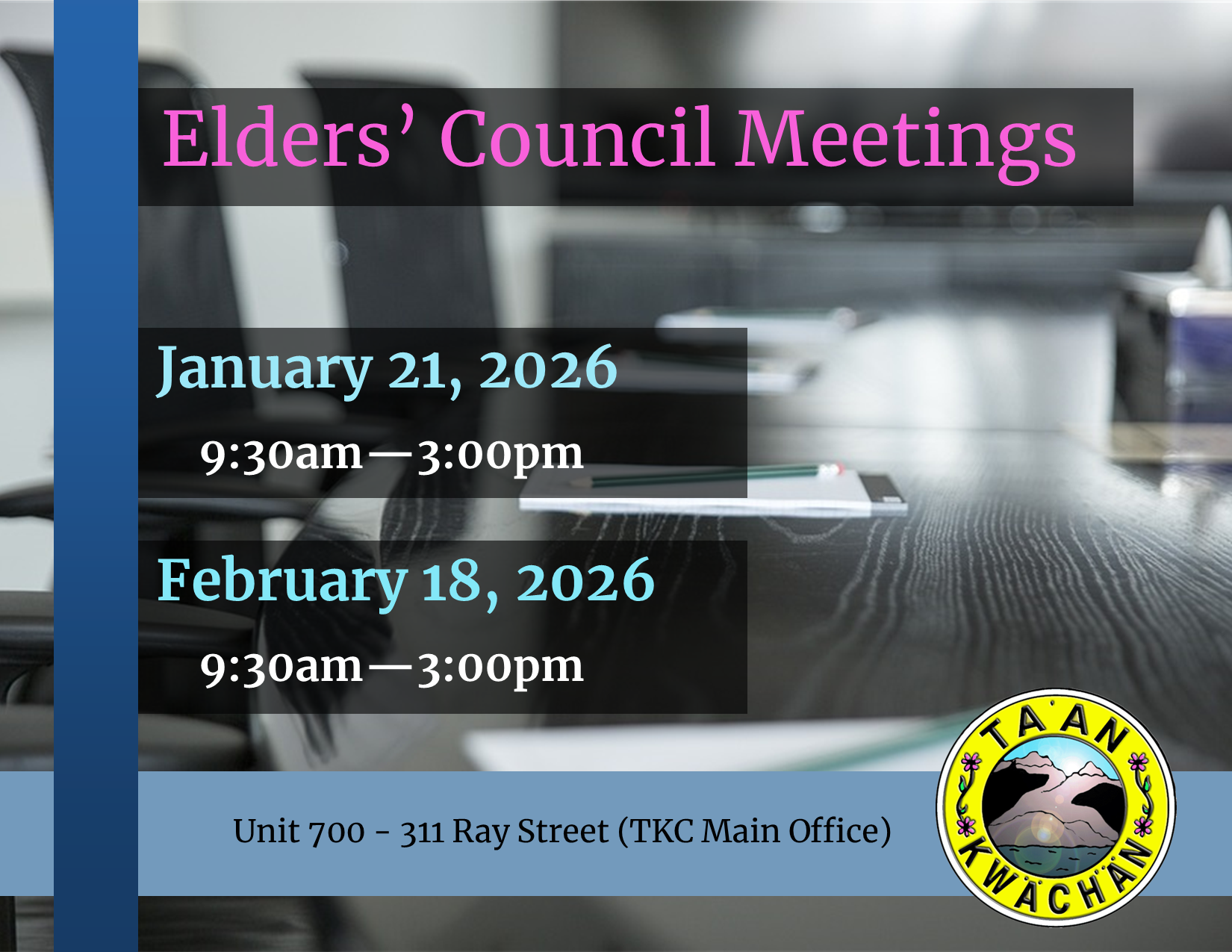 “To provide, promote, protect and sustain a healthy, strong lifestyle for our Citizens and future generations consistent with the traditional values of the Ta’an Kwäch’än.”