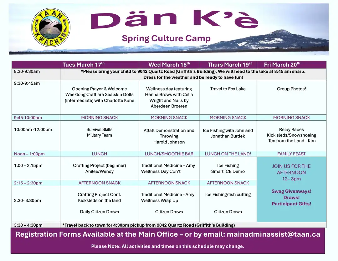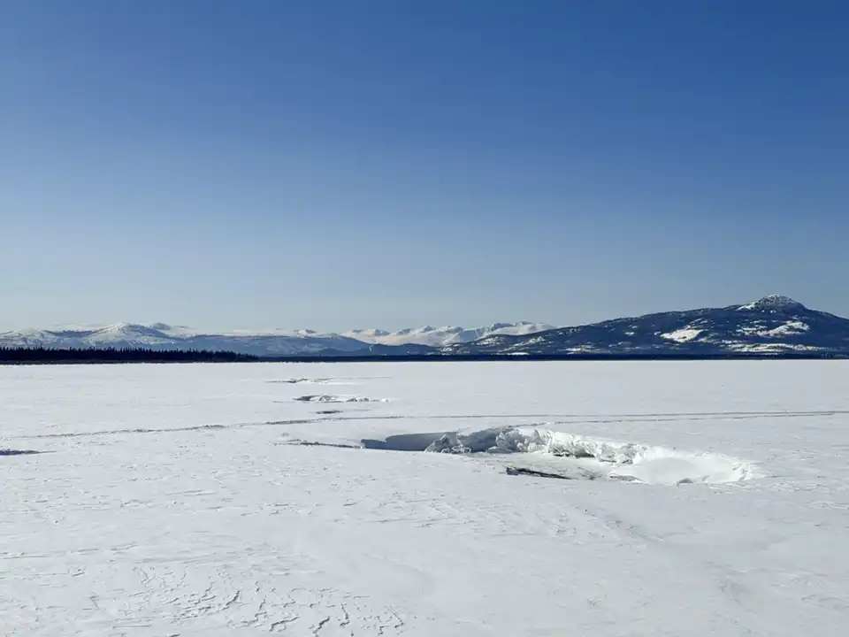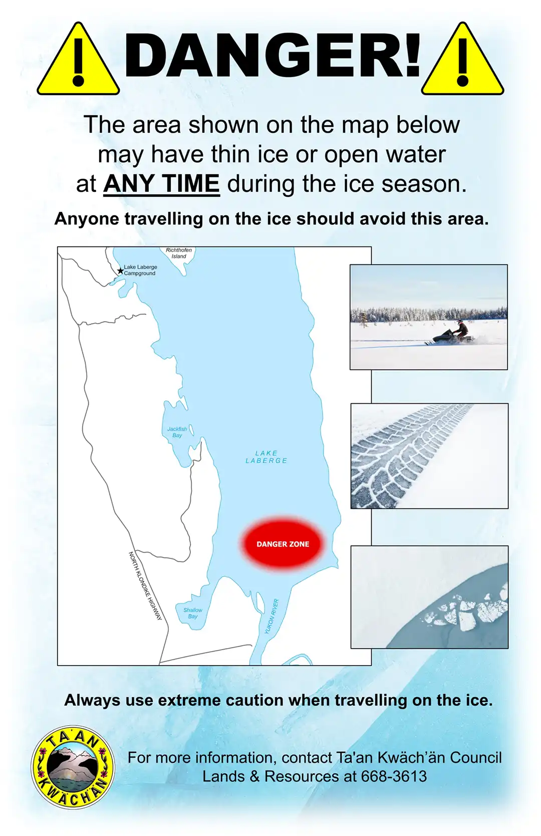 Fast water flow entering Tàa’an Mǟn (Lake Laberge) can erode the ice from underneath and snow can float over open water, creating thin ice and obscuring open water areas anytime during the ice season. Past records indicate that these dangerous travel areas occur along the delta edge at channel mouths. Because the delta channels are highly dynamic—shifting in their location along the delta from season to season—the dangerous ice areas can also shift their position from year to year. Over the last several decades, they have been observed on satellite imagery anywhere within a 1.5-kilometre-wide area across the delta front and extending hundreds of metres out into the lake. It is recommended that ice users always avoid this area during the ice season.