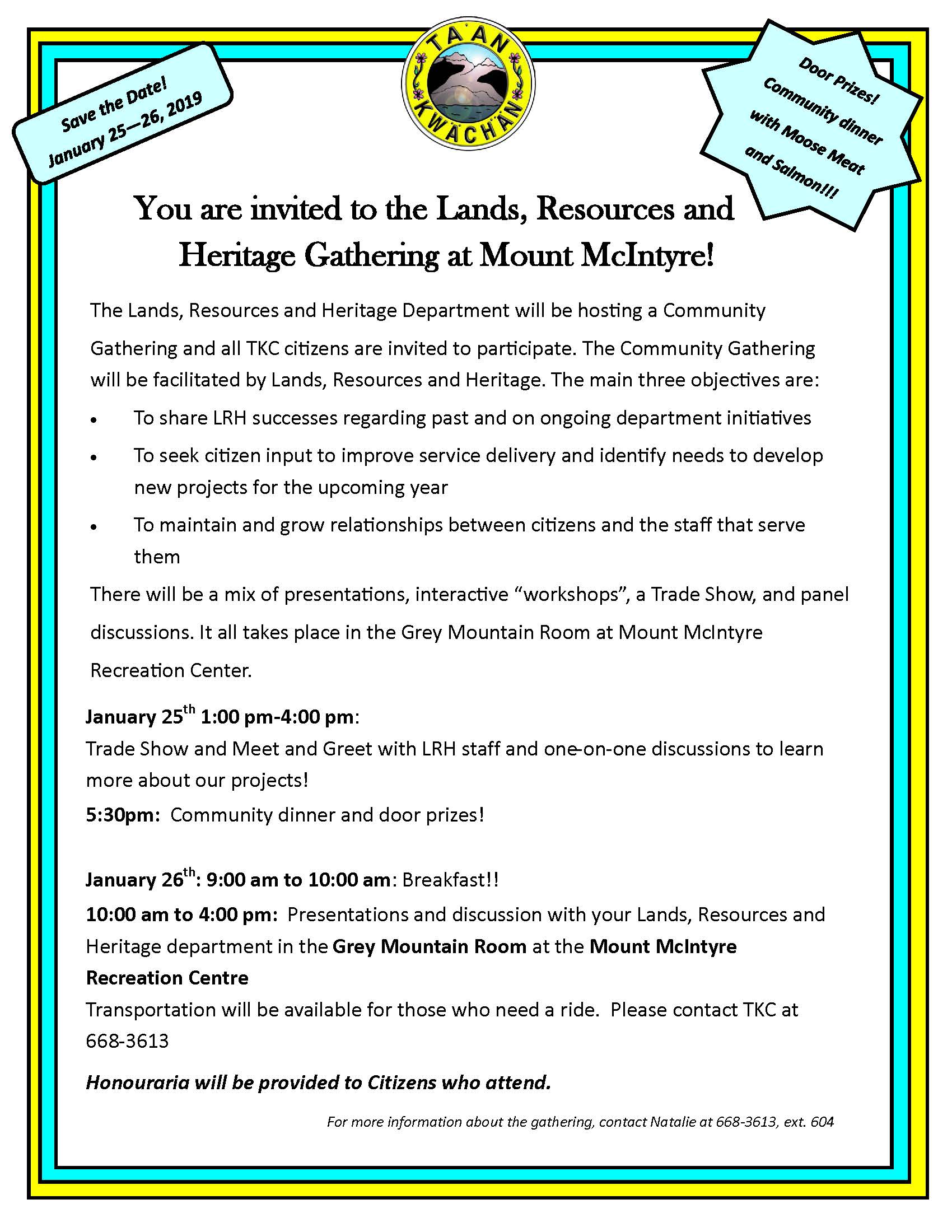 The Lands, Resources and Heritage Department will be hosting a Community Gathering on January 25th and 26th. All TKC citizens are invited to participate. The Community Gathering will be facilitated by LRH and will take place at the Mount McIntyre Recreation Center in the Grey Mountain Room!