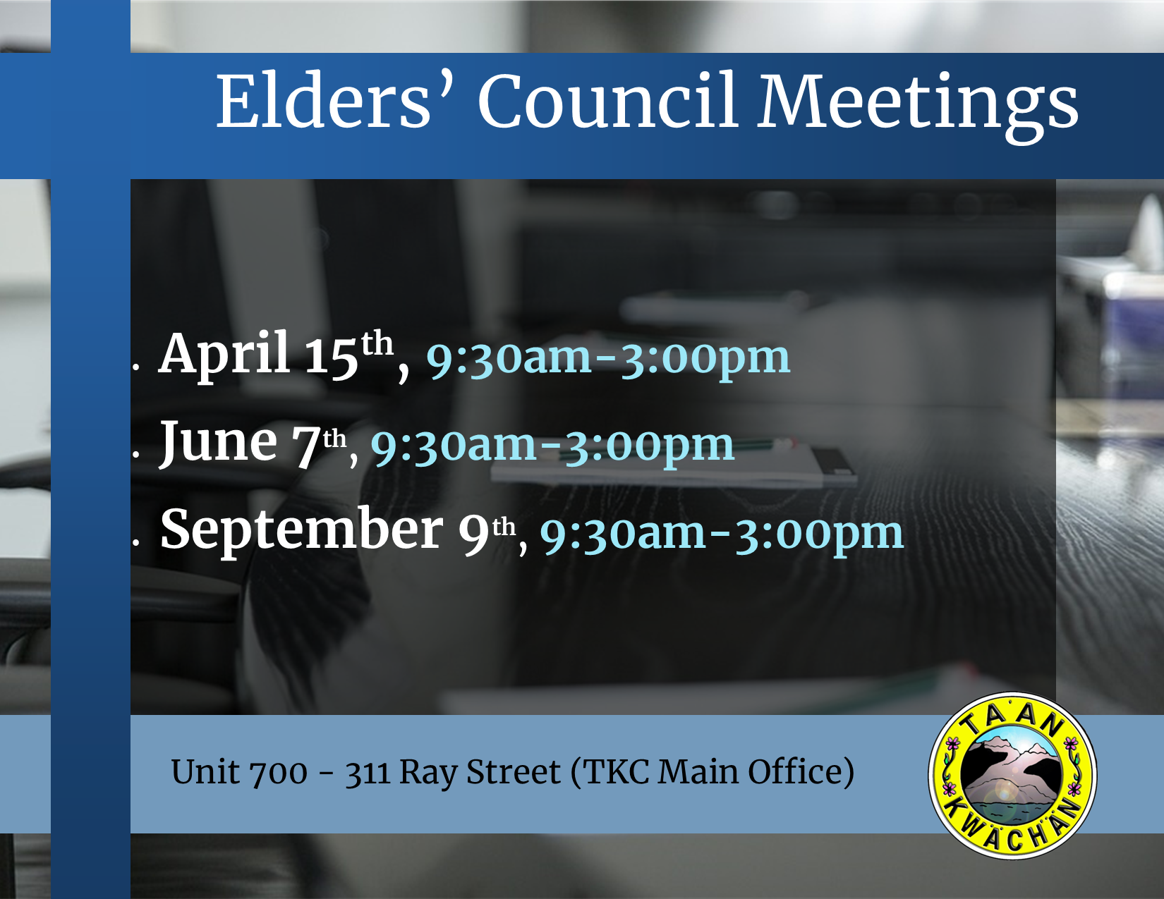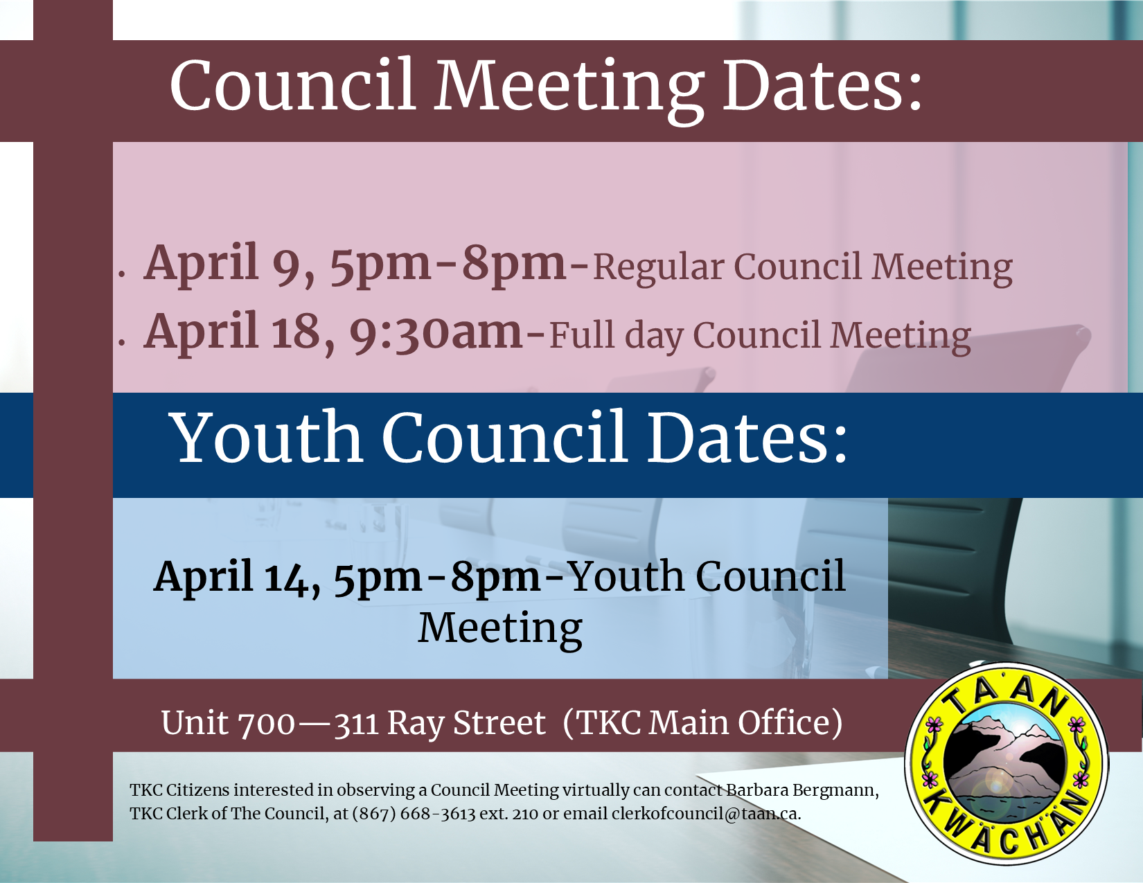 TKC Citizens interested in observing a Council Meeting virtually can contact Barbara Bergmann, TKC Clerk of The Council, at (867) 668-3613 ext. 210 or email clerkofcouncil@taan.ca.