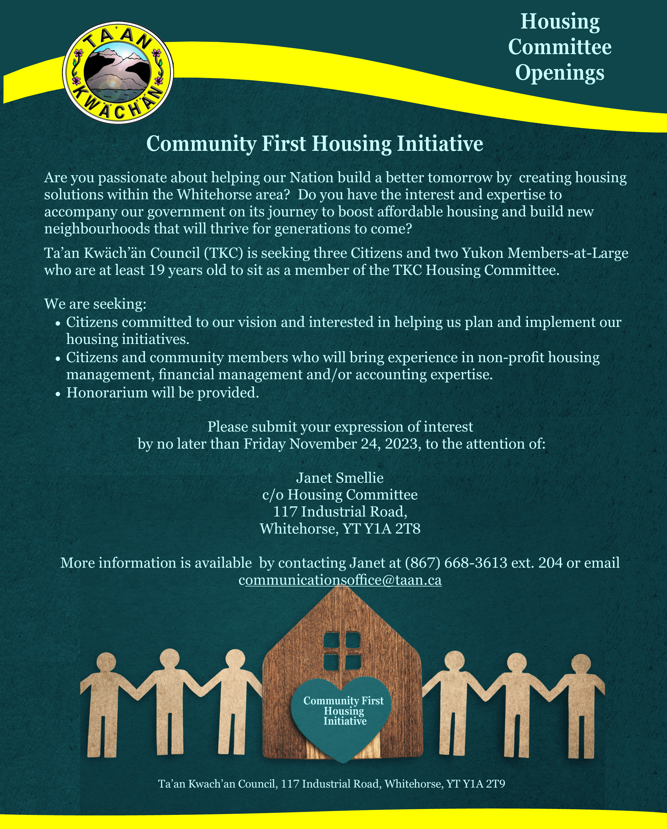 Ta’an Kwäch’än Council (TKC) is pleased to announce plans for the development of two new housing initiatives on Self-Governing Settlement Lands in Whitehorse to address the housing crisis facing its community. Development will transform two parcels of TKC Settlement Lands within the City of Whitehorse into two small subdivisions. The site at Whistle Bend (C-9B) will involve developing a portion of the 20-hectare parcel to create 24 townhomes. A second site, located on Birch Road in Porter Creek (C-16B) will see subdivision development for 24 lots to accommodate future single-family homes. Home occupancy is expected to take place by 2024.