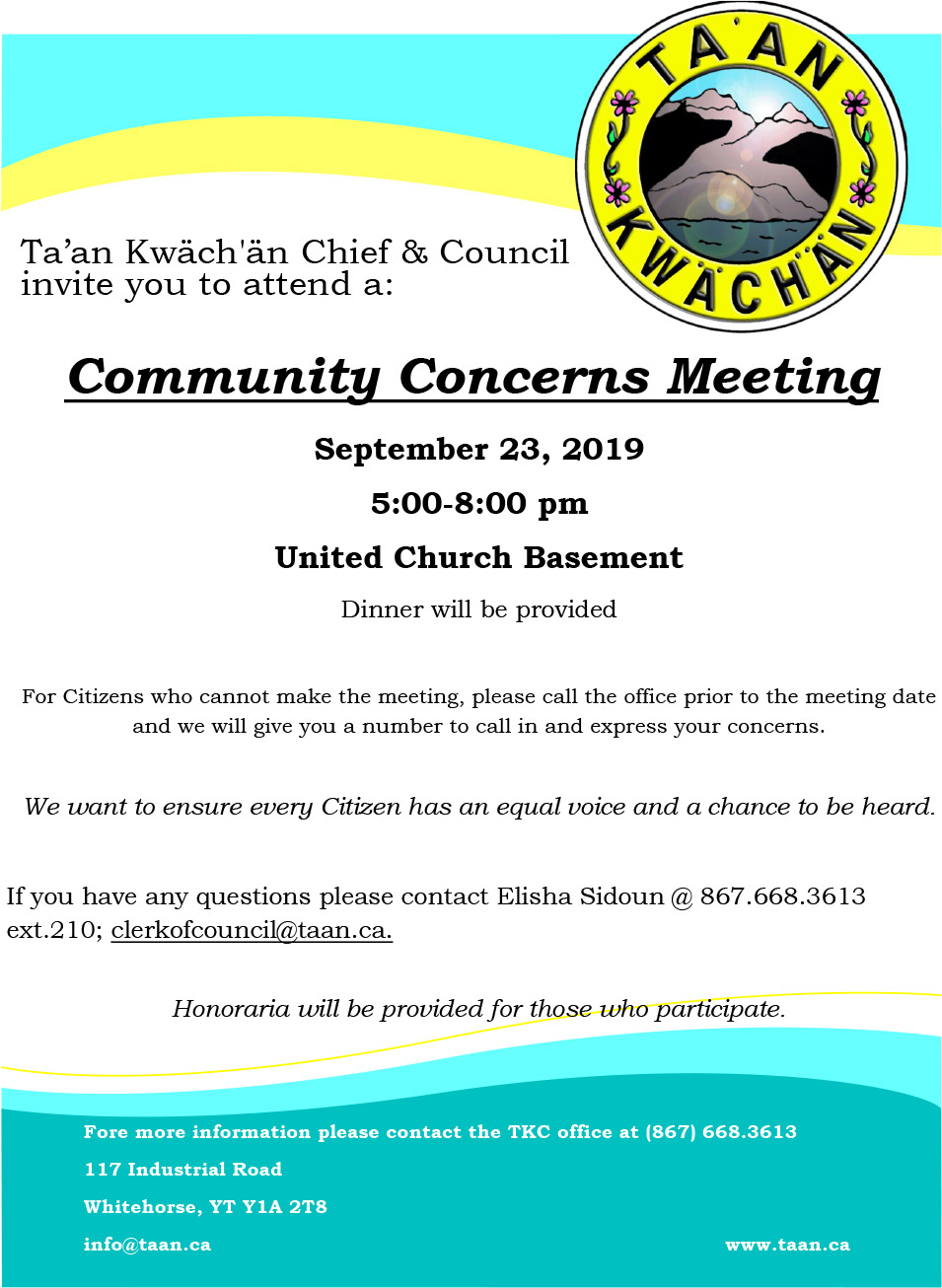 TKC will be having a Community Concerns meeting on Monday, September 23rd. If you cannot make the meeting and wish to contribute to the discussion, please contact Elisha Sidoun, Clerk of Council at 668-3613 x210 or clerkofcouncil@taan.ca. Dinner and honouraria will be provided.