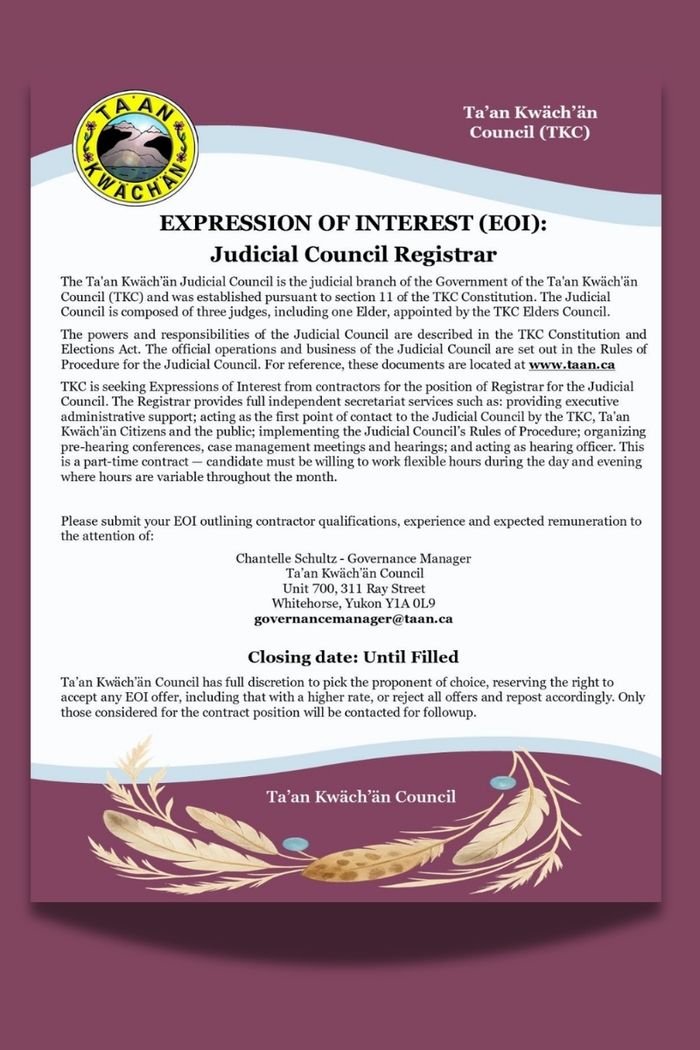 Ta’an Kwäch’än Council is seeking a Judicial Council Registrar to support the work of our Judicial Council. This role helps organize hearings, maintain records, and ensure our Nation’s laws and processes are carried out properly.